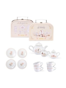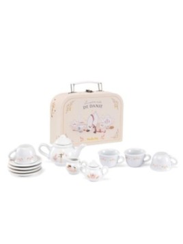 Prix 9,95 €Service à thé en céramique orné de délicats motifs roses et dorés, présenté dans un ravissant coffret illustré pour servir le goûter à sa maman et ses amies les petites souris. Comprend 1 théière, 4 tasses et 4 assiettes, 1pot à lait et 1 sucrier.