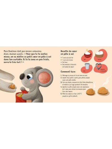 Avec l'aide de ses parents, de sa maîtresse et d'un adorable petit coeur en pâte à sel (dont la recette se trouve à l'intérieur du livre), Koalinou pourra affronter sereinement la séparation d'avec ses parents et l'angoisse de l'entrée à l'école maternelle.