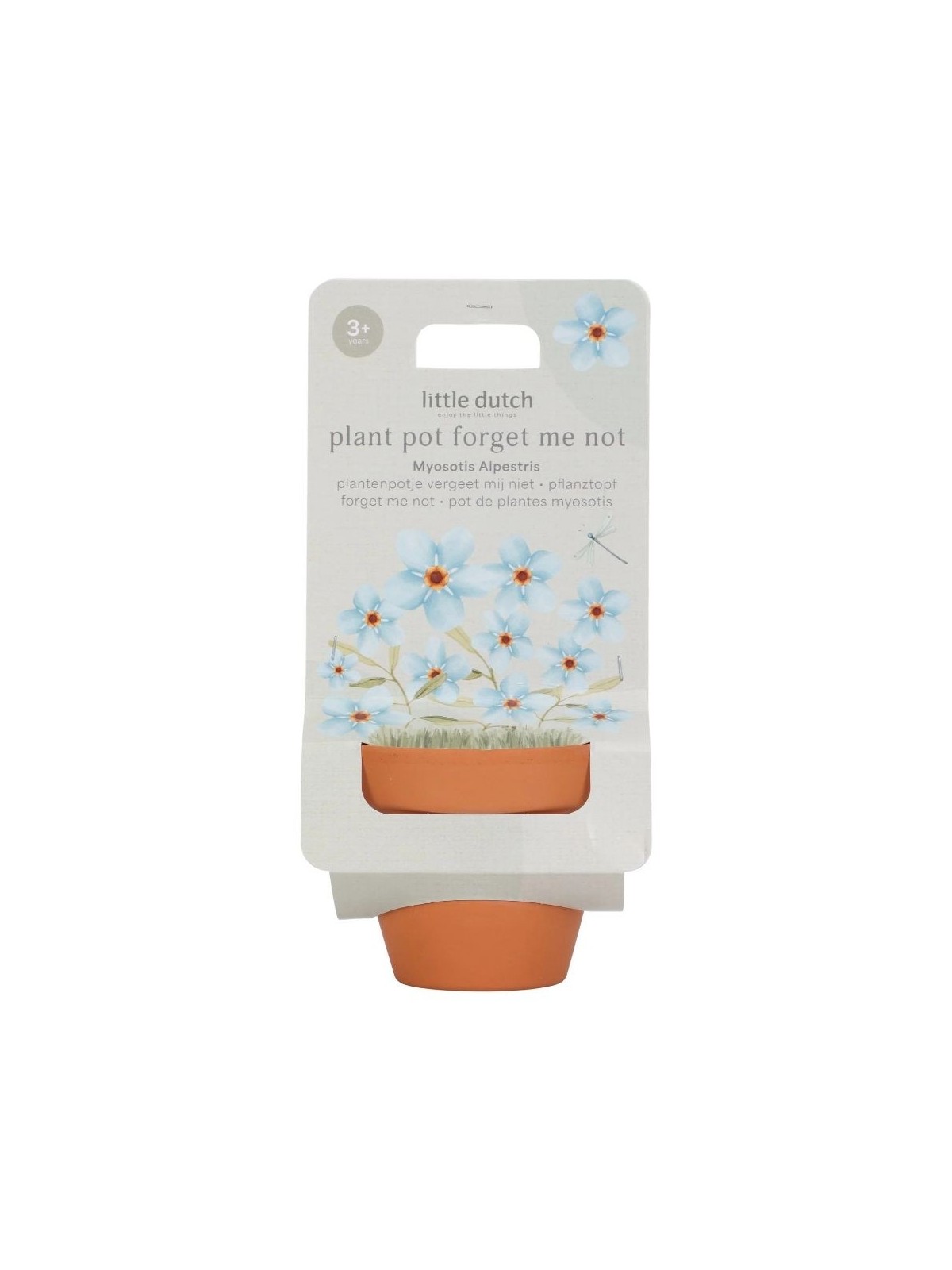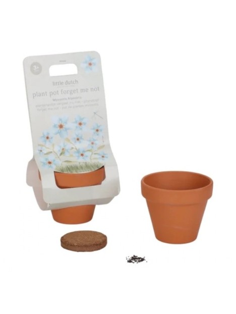 Ce pot en terre cuite est livré avec une pastille de terre et des graines de myosotis.