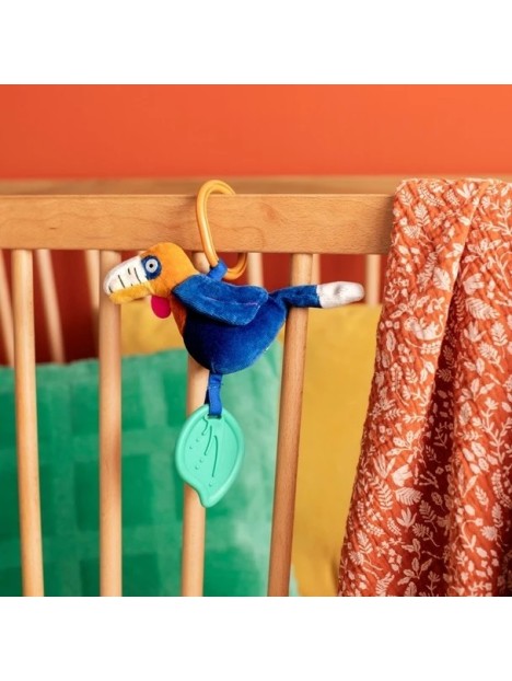 Ce jouet à suspendre Calao d'activités de la collection La Forêt Mawa de Moulin Roty accompagne bébé dans ses premiers moments d'éveil avec douceur et couleur. Facile à accrocher à une poussette, un cosy ou une arche, ce calao coloré stimule les sens grâce à sa clochette dissimulée dans le ventre, idéale pour éveiller l'ouïe. Ses ailes bruissantes qui font
