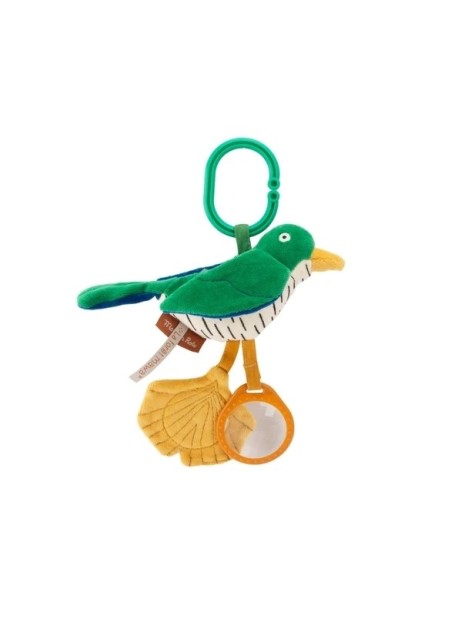 Ce coucou coloré, habillé aux teintes douces et naturelles de la forêt Mawa, cache une petite clochette dans son ventre qui éveille l'ouïe de votre enfant. Il est également équipé d'un miroir et d'un prisme grossissant pour stimuler la vue, ainsi que d'ailes à frictionner pour développer le toucher. Facile à suspendre au-dessus du lit ou de l'aire de jeu, ce jouet d'éveil favorise l'exploration et la motricité tout en offrant des moments de jeu captivants et rassurants pour bébé.