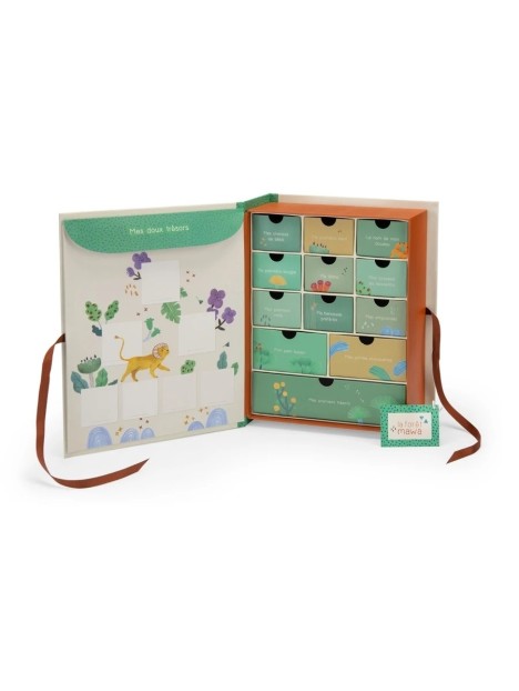 Ses petits tiroirs permettent de ranger les premiers trésors de bébé, des dents de lait aux petites médailles ou photos précieuses. Les délicates illustrations des personnages de la forêt Mawa, signées élodie Coudray, apportent une touche poétique et chaleureuse, tandis que les liens de fermeture sécurisent le contenu. Un cadeau de naissance raffiné et pratique, parfait pour accompagner chaque étape de l'enfance.