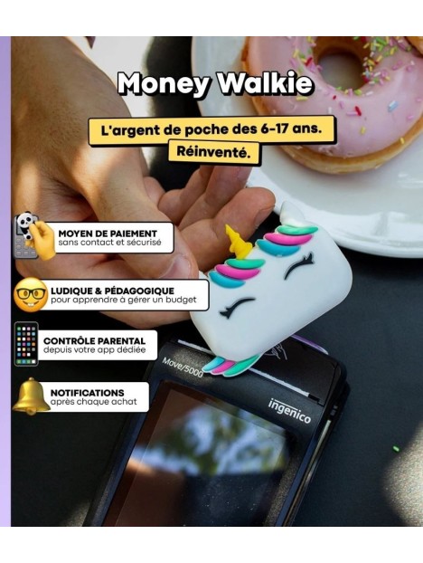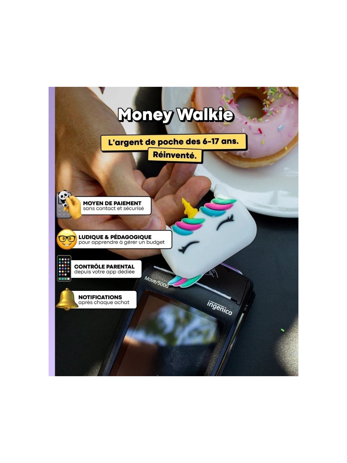 Money Walkie, c'est le moyen de paiement préféré des enfants et des ados ! Relié à une application parent, le Walkie permet de payer sans contact partout, en toute sécurité. Suivez les dépenses, fixez un budget et donnez-lui confiance pas à pas. Commandez votre Walkie Licorne (coque incluse) - conçu et fabriqué en France