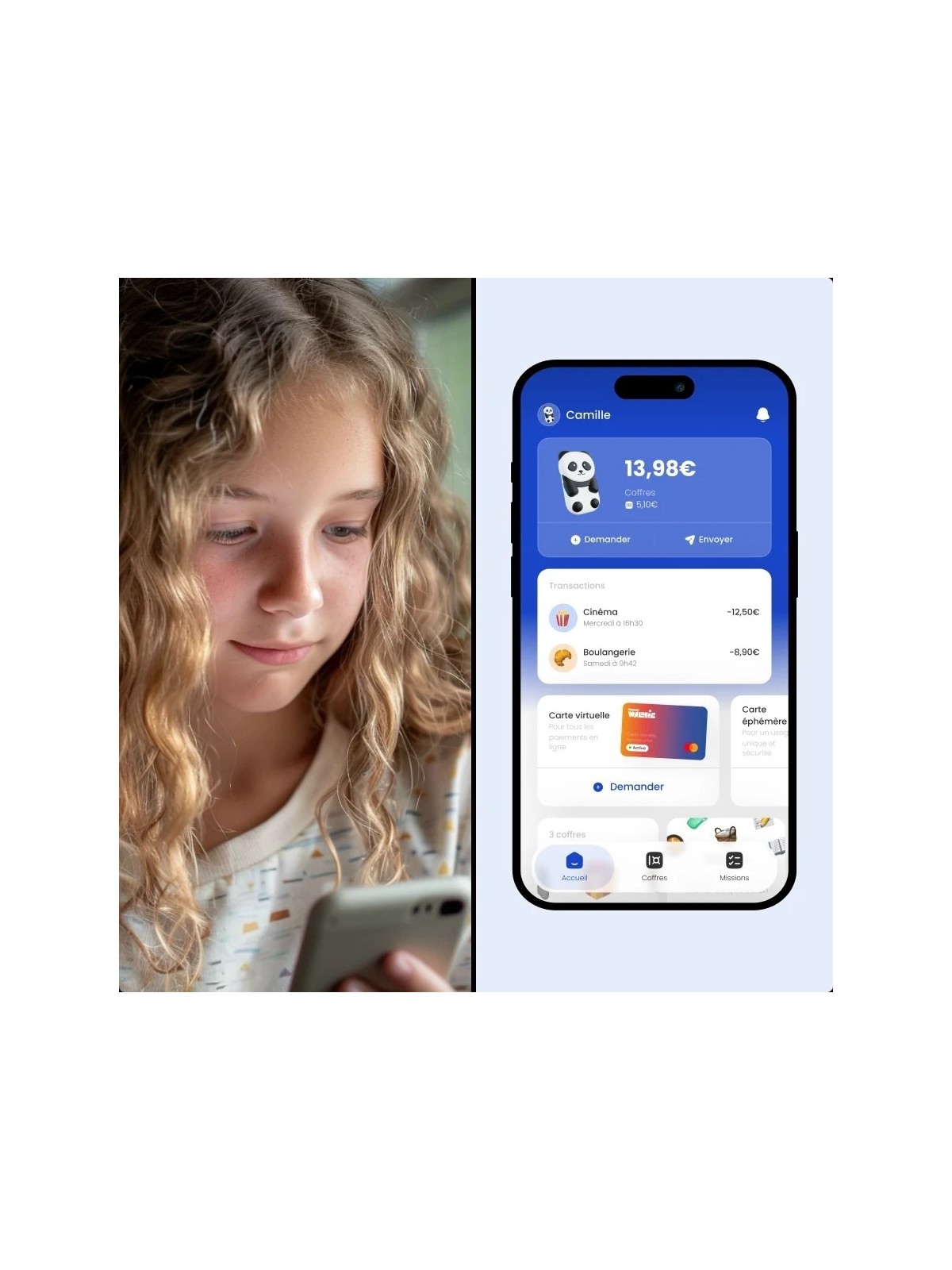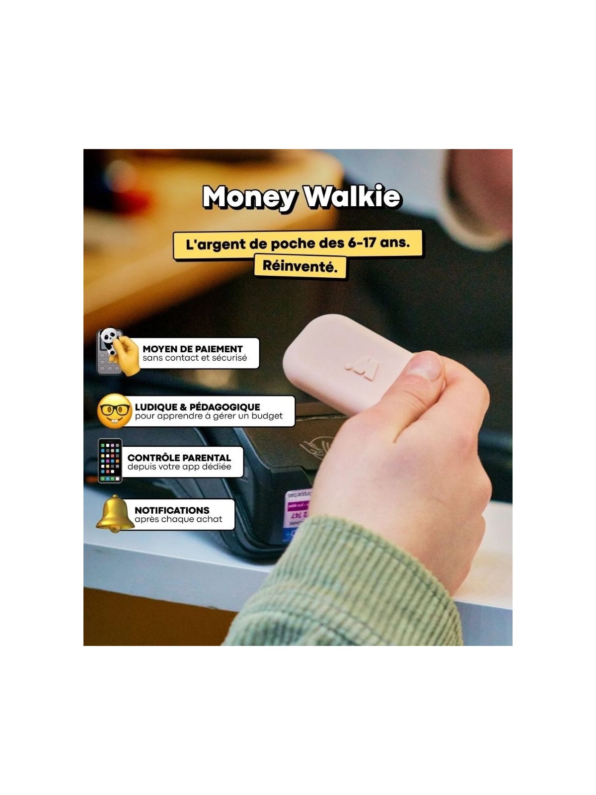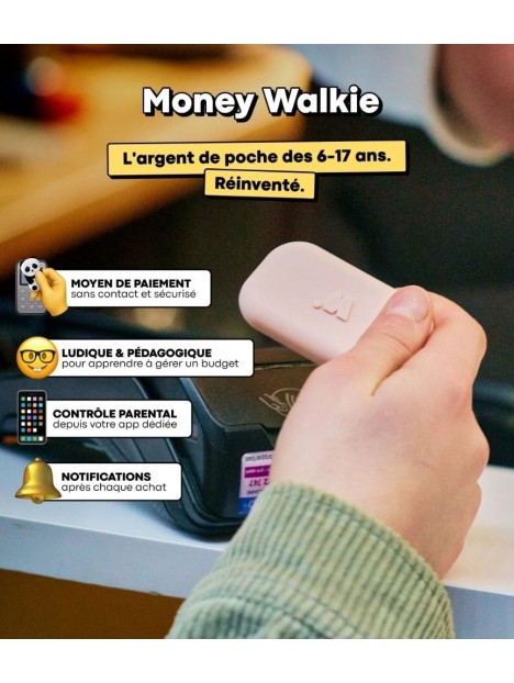 Money Walkie, c'est le moyen de paiement préféré des enfants et des ados ! Relié à une application parent, le Walkie permet de payer sans contact partout, en toute sécurité. Suivez les dépenses, fixez un budget et donnez-lui confiance pas à pas. Commandez votre Walkie Rose (coque incluse) - conçu et fabriqué en France