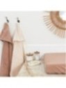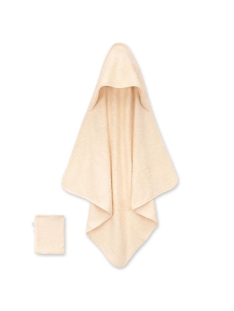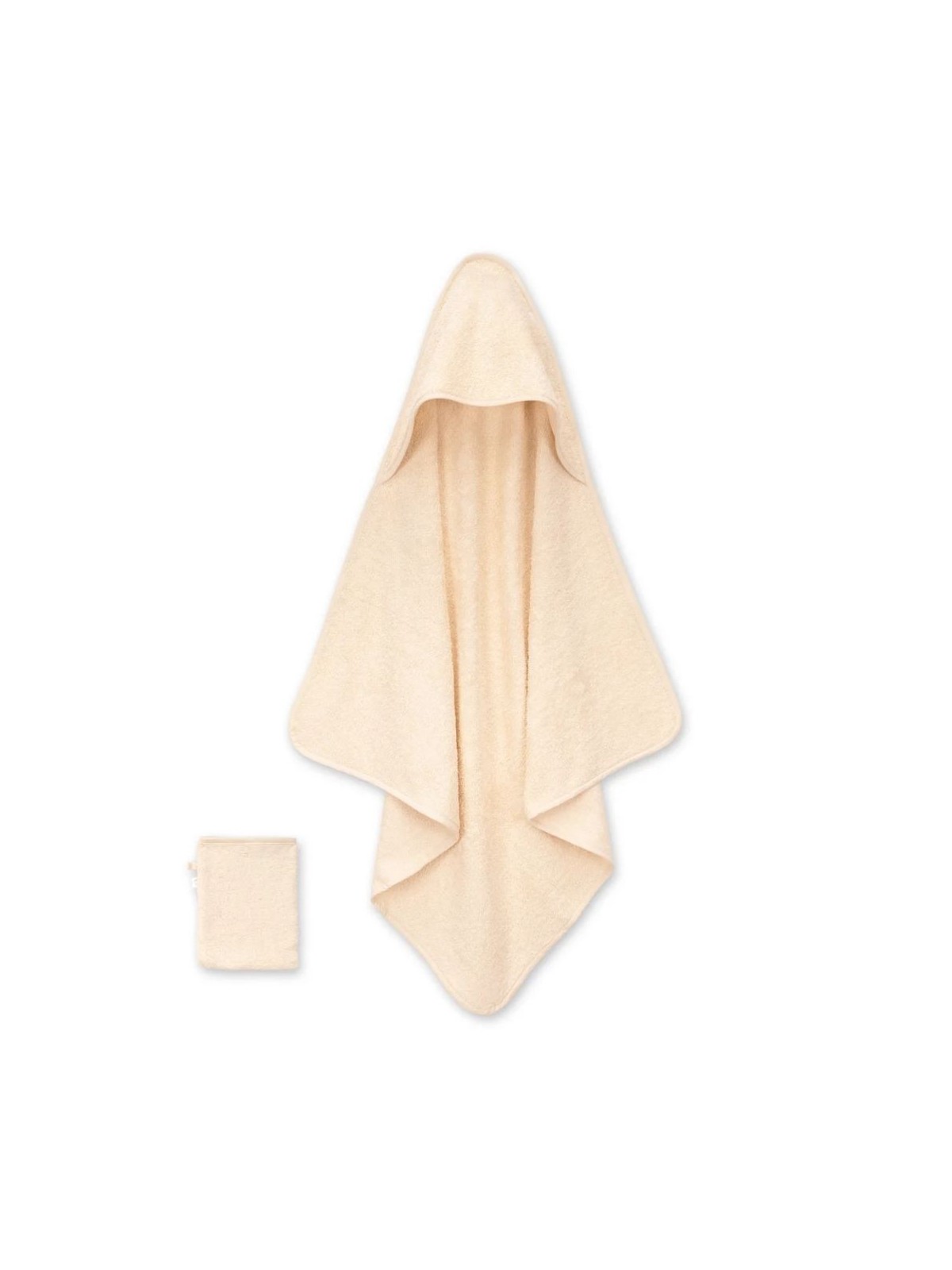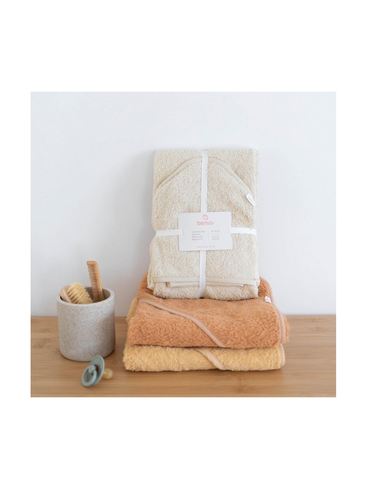 La cape de bain permet d'envelopper rapidement bébé après le bain et de l'essuyer délicatement tous les petits plis. Sa capuche garde la tête bien au chaud et lui assure un confort idéal. La serviette de bain et son gant de toilette assorti sont des indispensables dès la naissance.