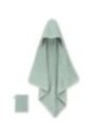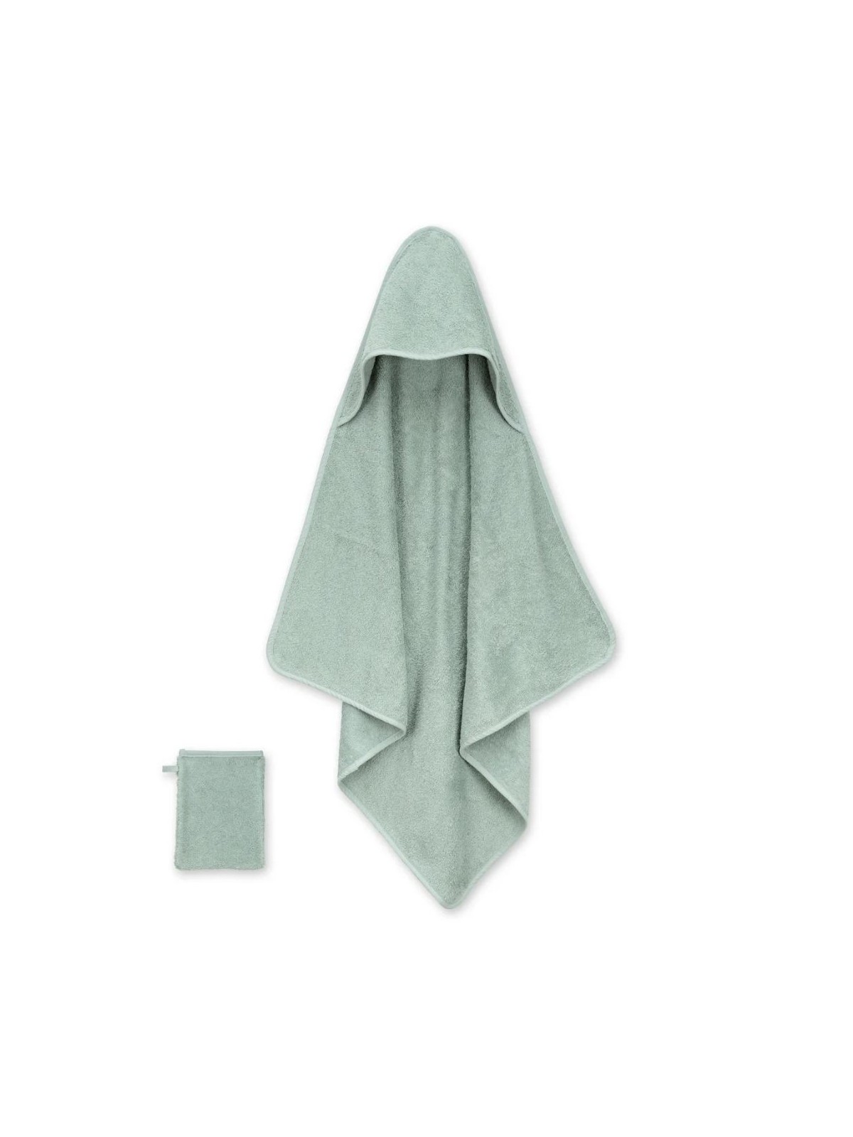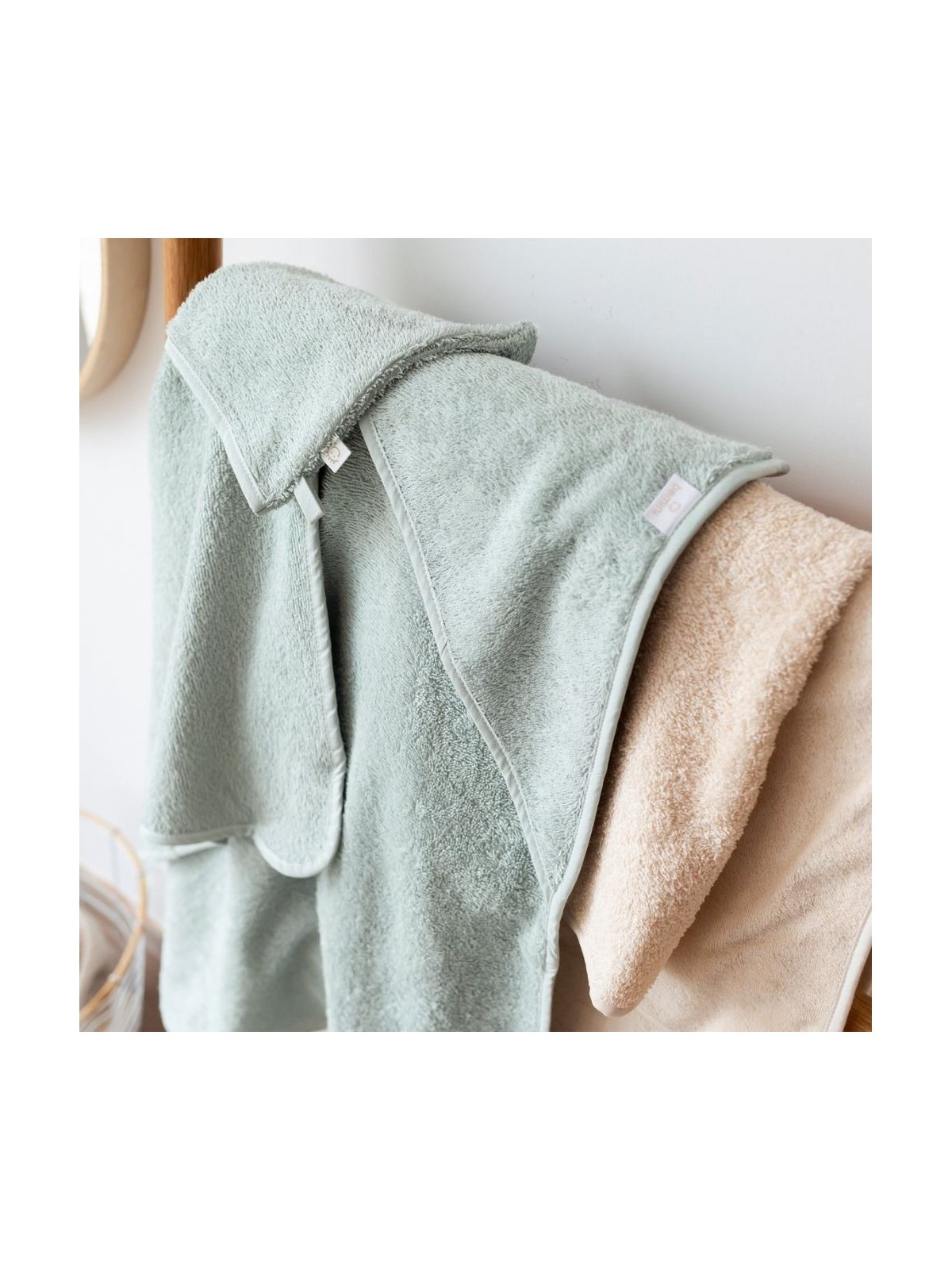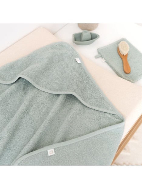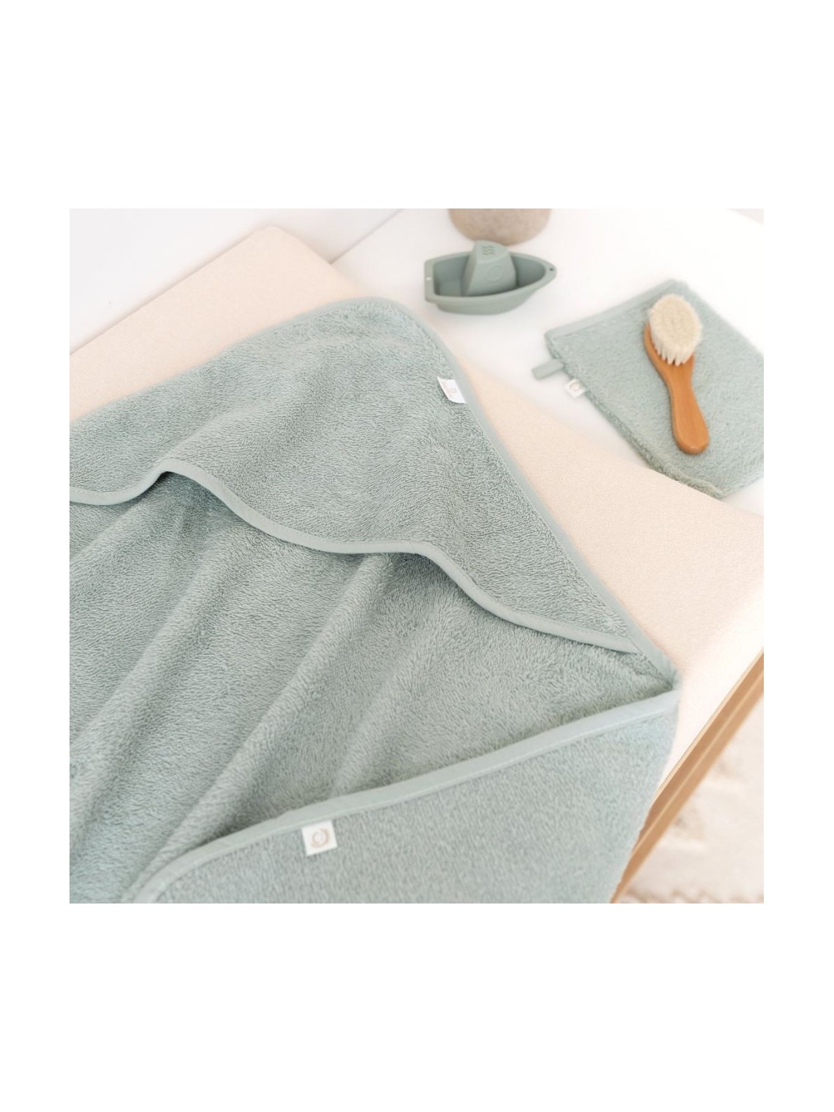 La cape de bain permet d'envelopper rapidement bébé après le bain et de l'essuyer délicatement tous les petits plis. Sa capuche garde la tête bien au chaud et lui assure un confort idéal. La serviette de bain et son gant de toilette assorti sont des indispensables dès la naissance.