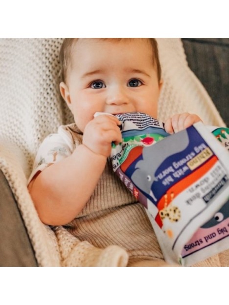 Contient : 1 livre bébé en tissu lavable 6 pages, format 18 x 24 cm