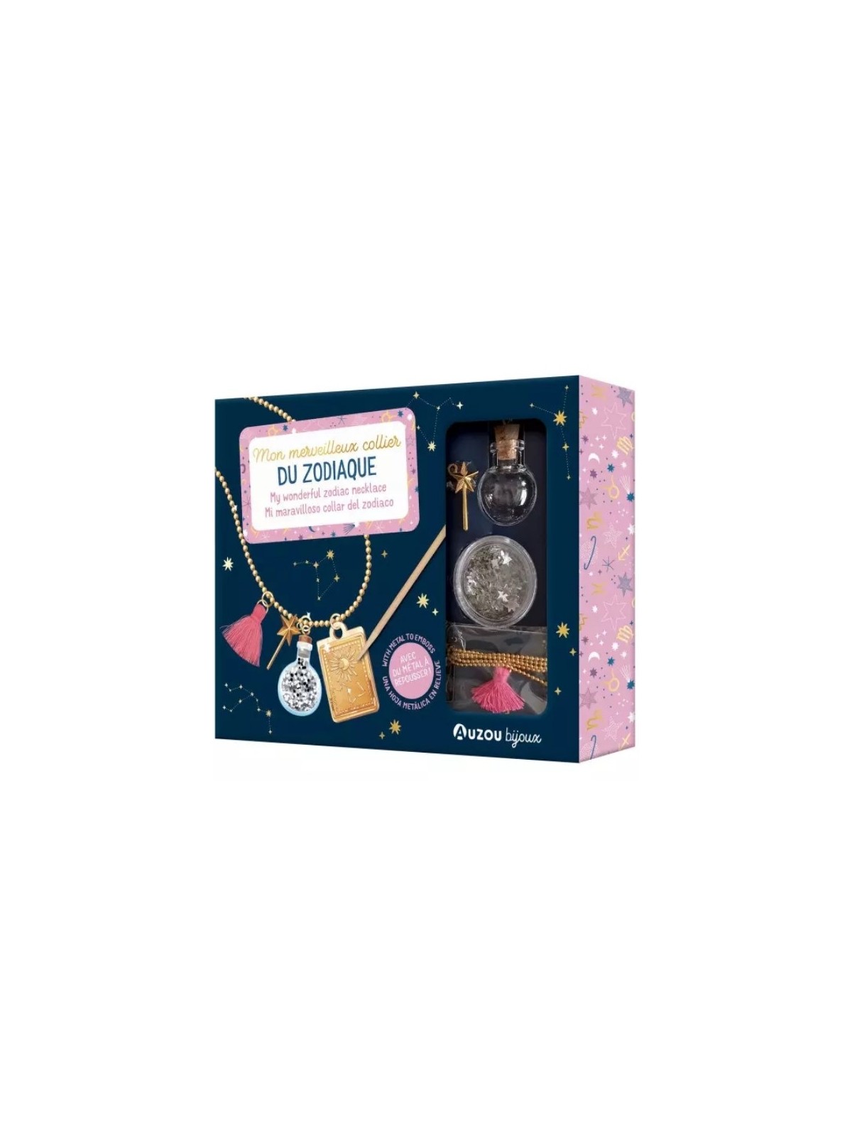 Un livret de pas à pas et plein d'accessoires : une fiole, des paillettes, un charms baguette magique, un pompon, une chaîne billes...
