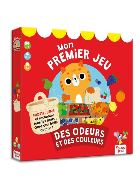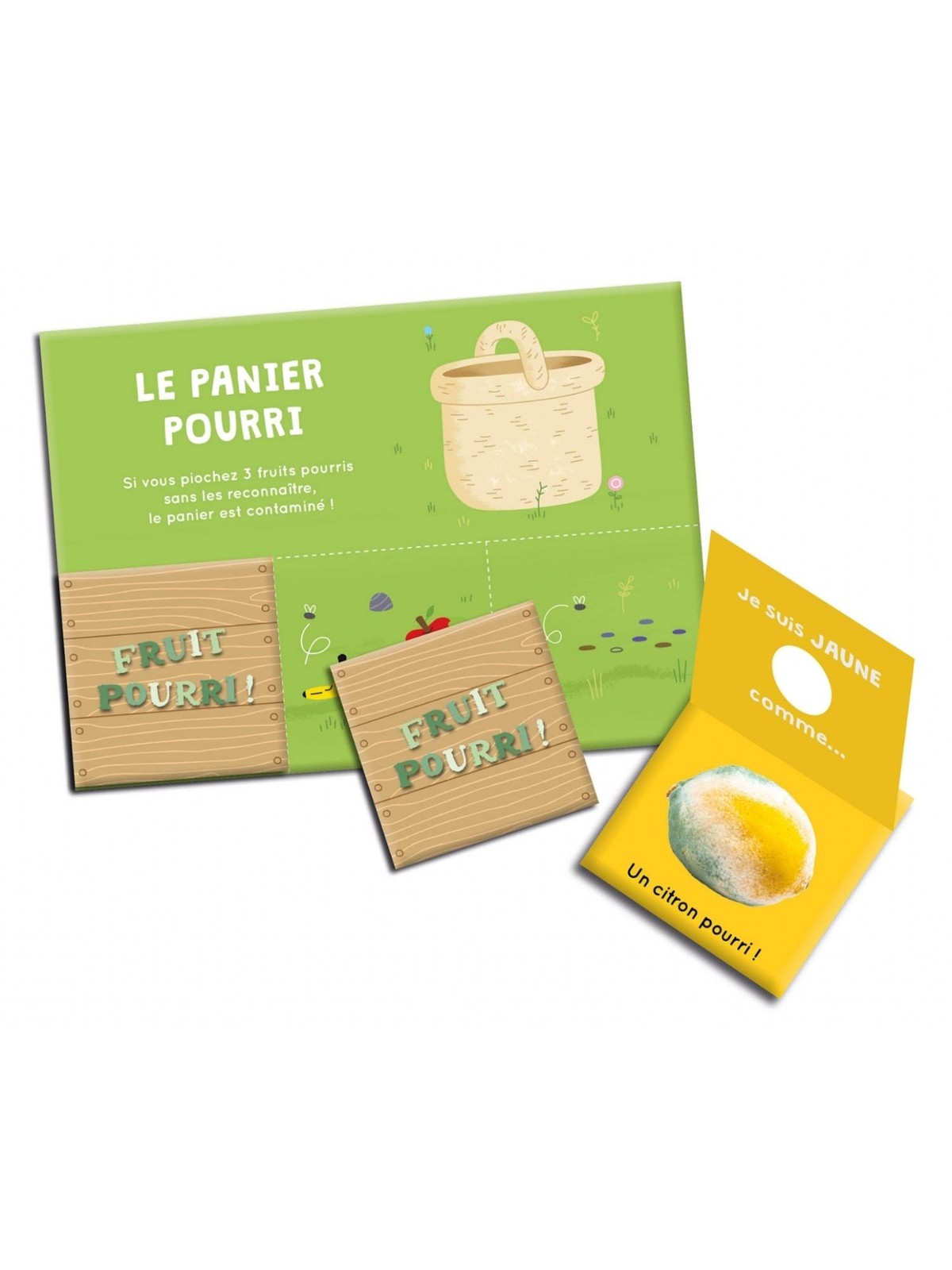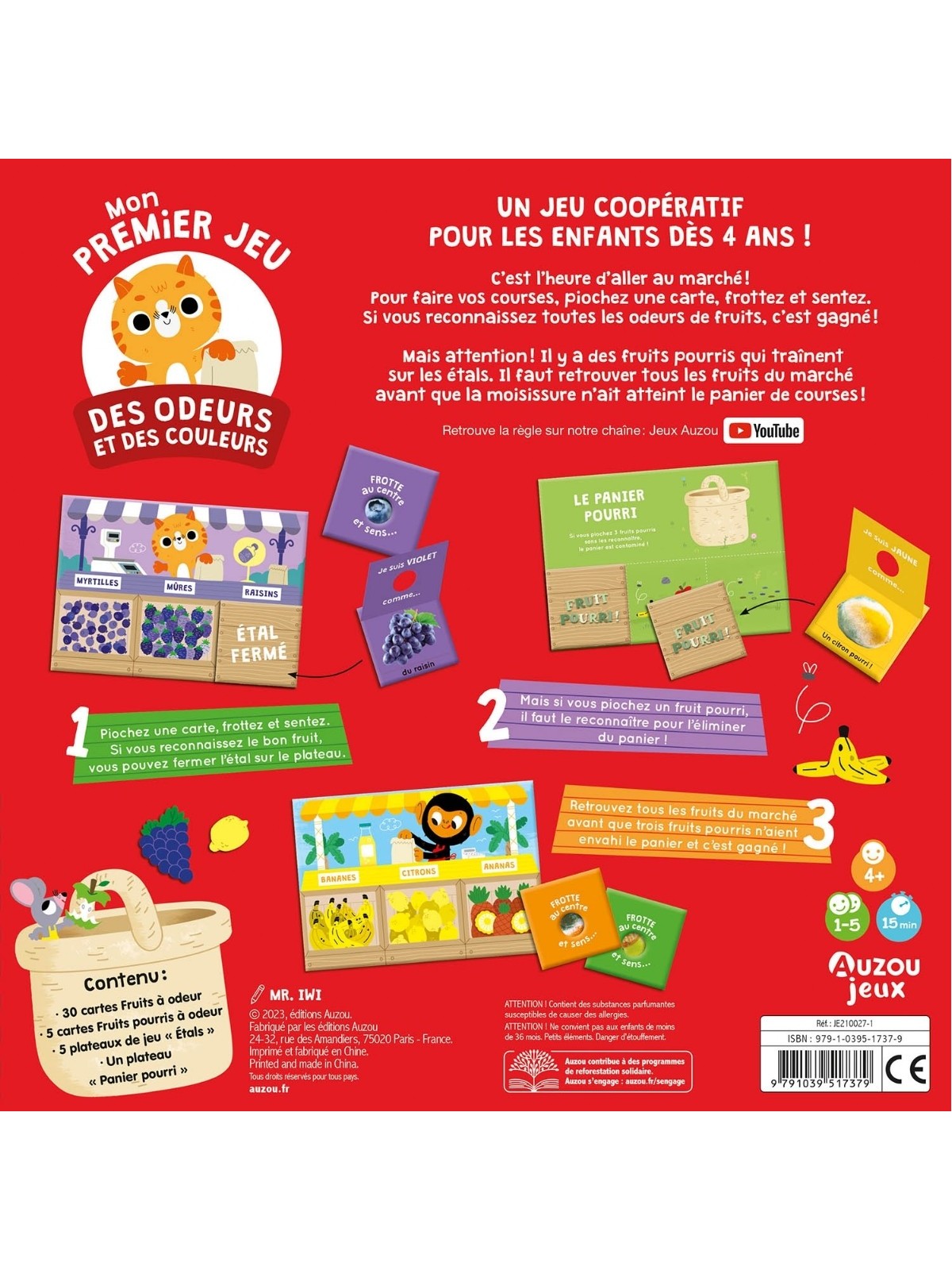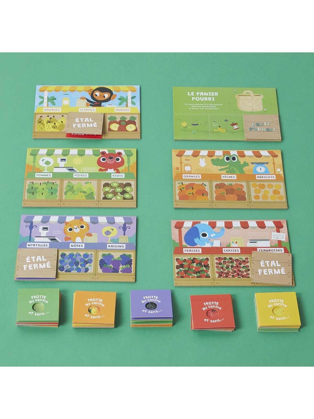 C'est l'heure d'aller au marché ! Pour faire vos courses, piochez une carte, frottez et sentez. Si vous reconnaissez toutes les odeurs de fruits, c'est gagné ! Mais attention ! Il y a des fruits pourris qui trainent dans les étals. Il faut retrouver tous les fruits du marché avant que la moisissure n'ait atteint le panier de courses !