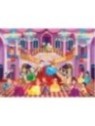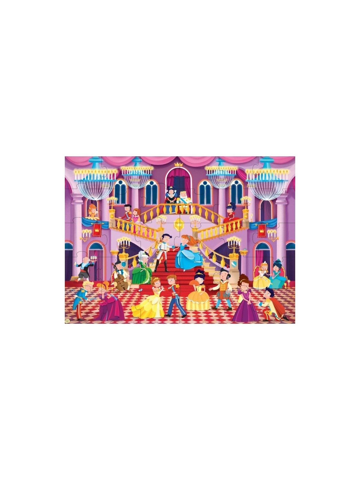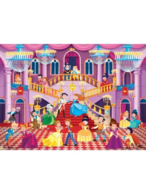 La salle est décorée, les bougies sont allumées, les invités sont arrivés : tout est prêt pour la soirée magique du grand bal ! Toutes les princesses portent leurs plus belles robes : laquelle d'entre elles sera choisie par le prince comme épouse ? Entrez dans le château, lisez l'histoire rimée, et construisez le gigantesque puzzle !