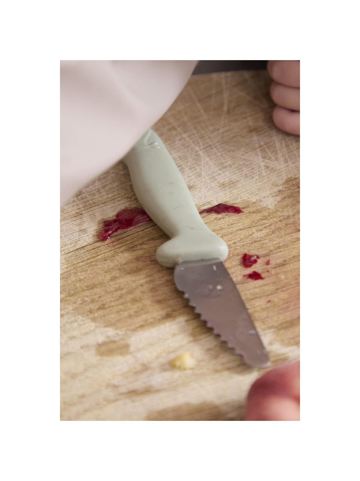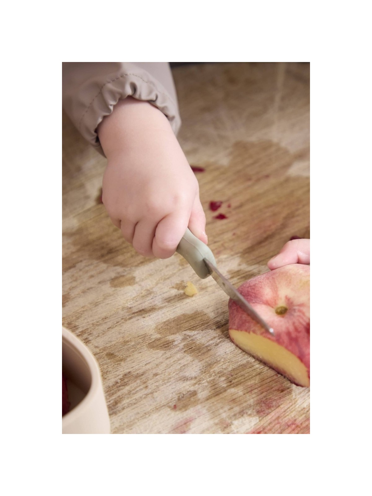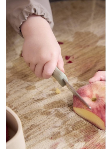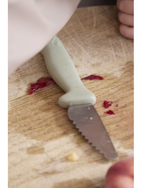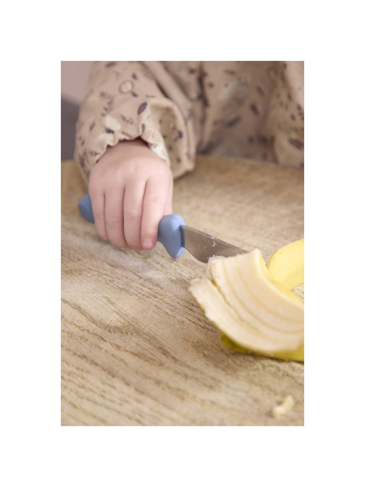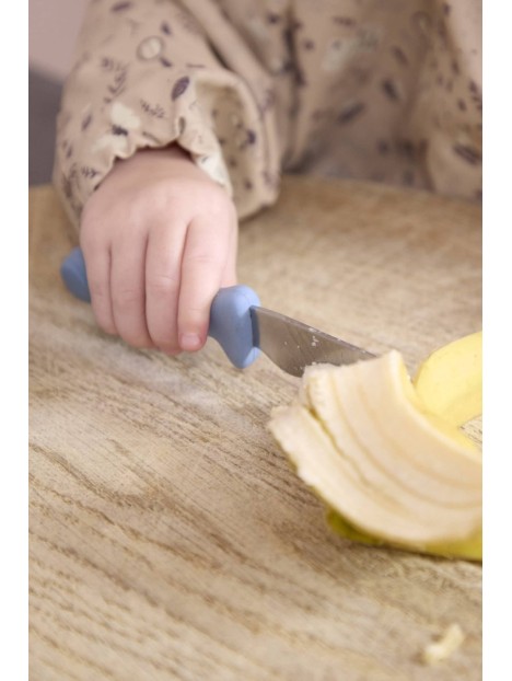 Ce set de couteaux pour débutants comprend un couteau dentelé et un couteau avec une lame en acier inoxydable « classique » qui peut couper des fruits et légumes. Les poignées en silicone souple, dotées d'une barrière de sécurité entre la lame et les doigts, sont faciles à tenir pour les petites mains.