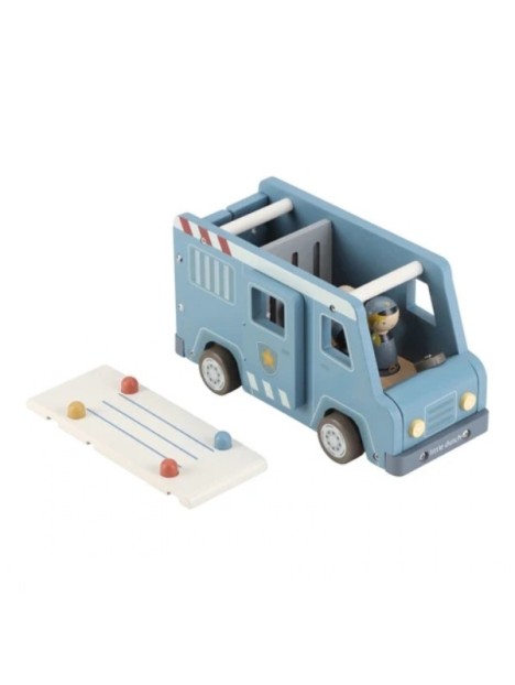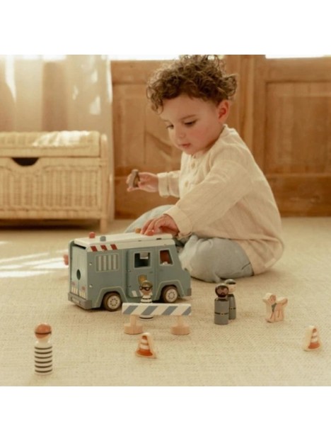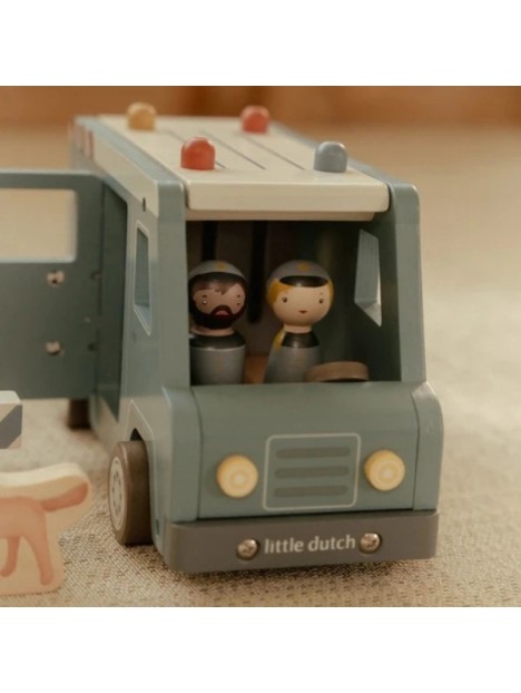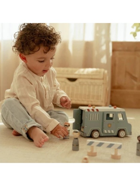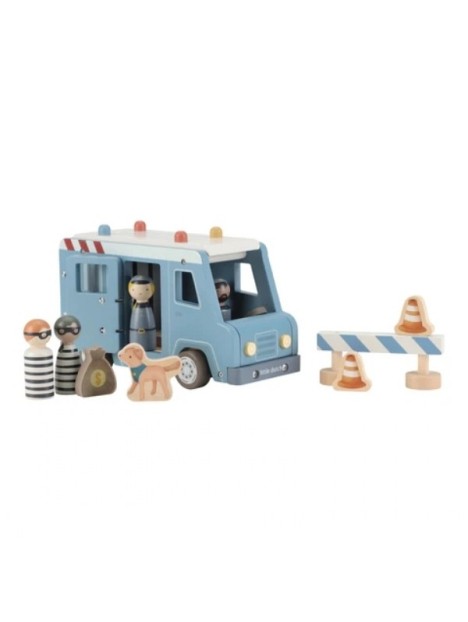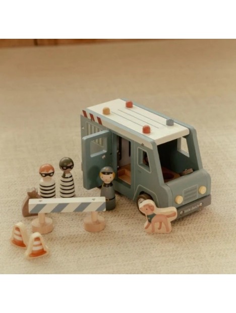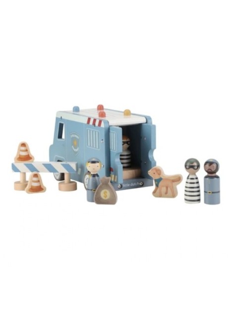 Bandits derrière les barreaux ! Ce bus de police en bois contient quatre figurines (deux policiers et deux bandits), un chien policier, un sac d'argent, des cônes et une barrière. Le bus a une cellule avec une porte rabattable, de sorte que les bandits peuvent être transportés en toute sécurité. Rejouez des aventures policières passionnantes et gardez la ville en sécurité !