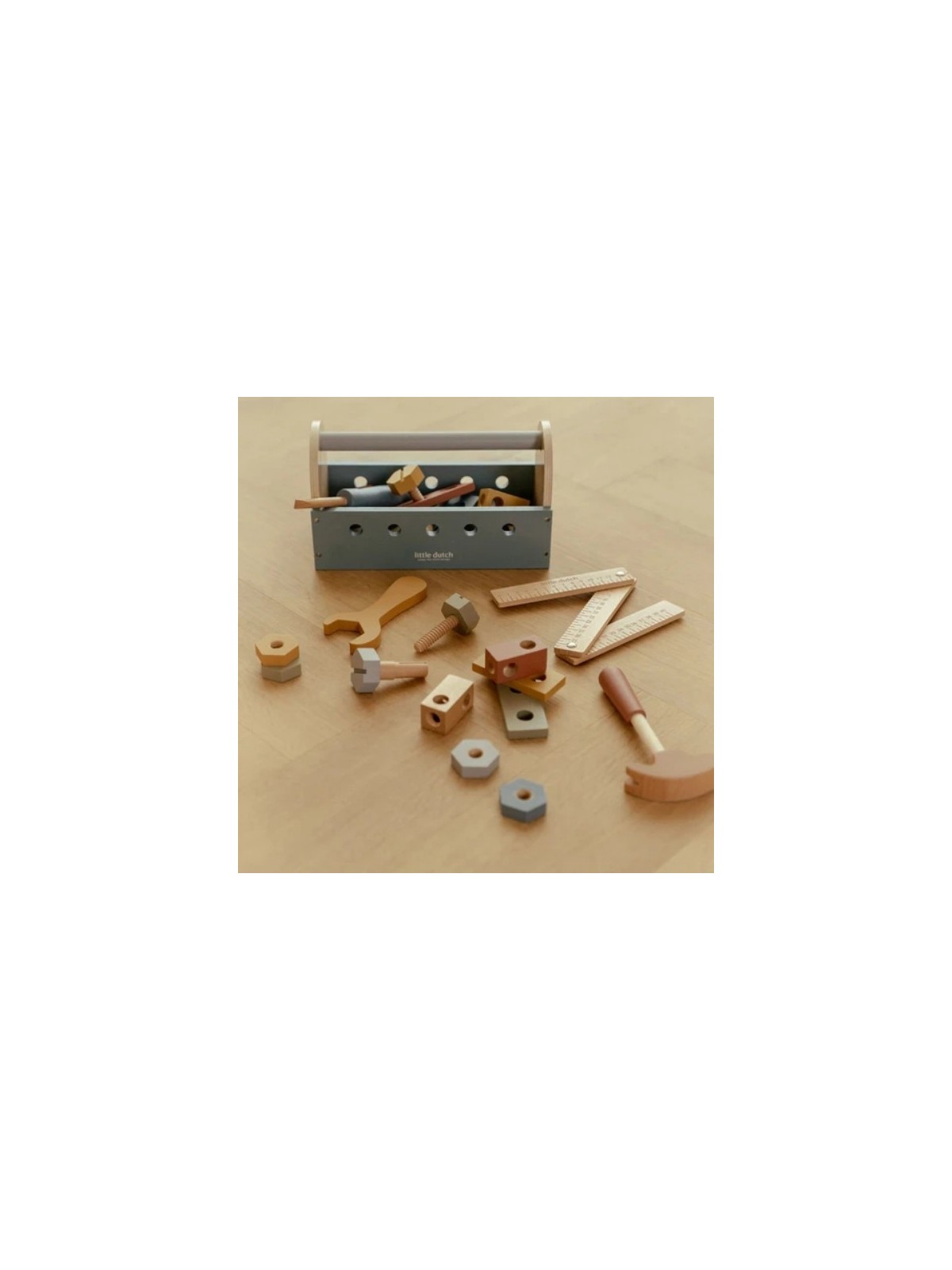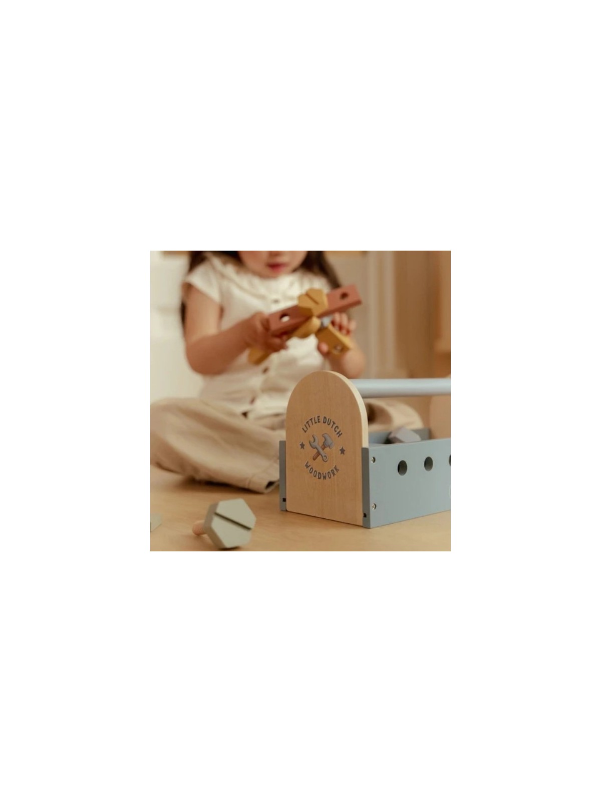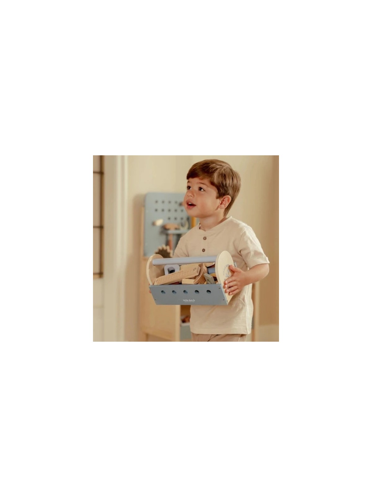 Tout ce dont un petit menuisier ou une petite menuisière a besoin ! Cette boîte à outils en bois contient un marteau, un tournevis et une clé à molette