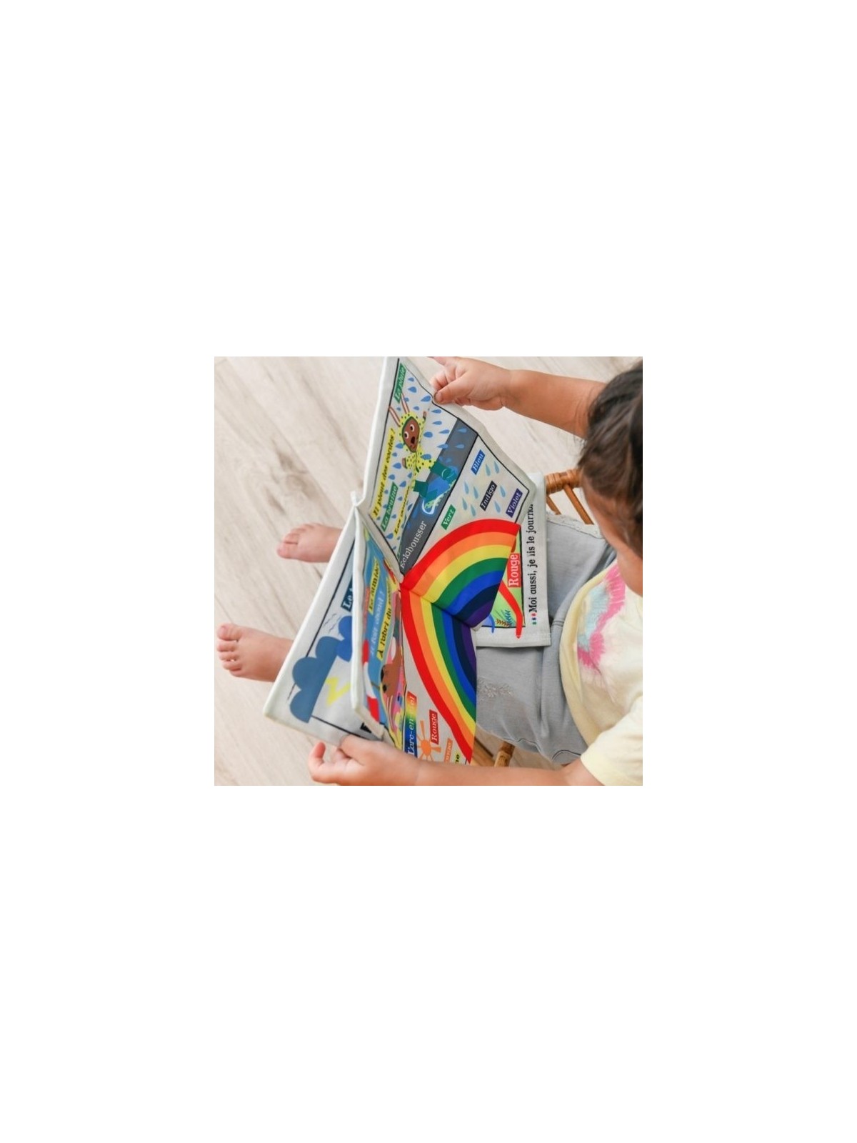 Contient : 1 livre bébé en tissu lavable 6 pages, format 18 x 24 cm