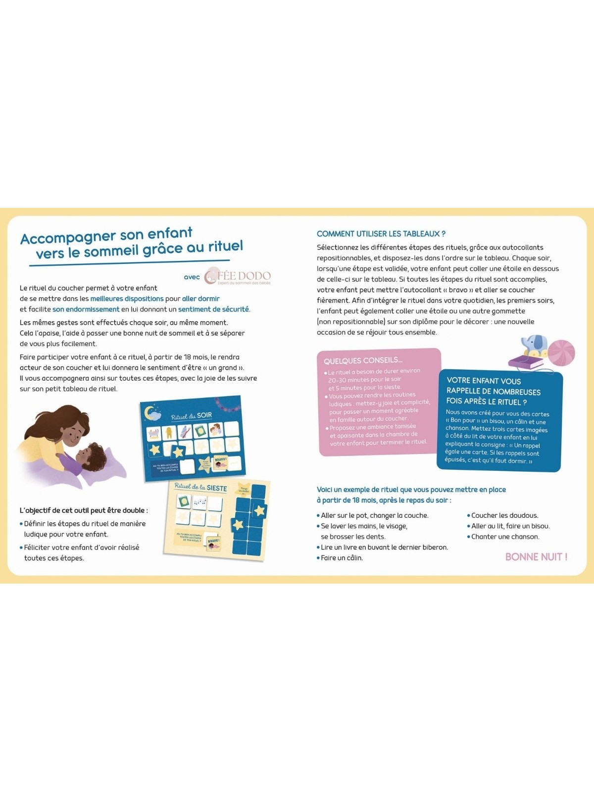 Le tout accompagné par les très précieux conseils de Fée Dodo, expert en sommeil des bébés et jeunes enfants.