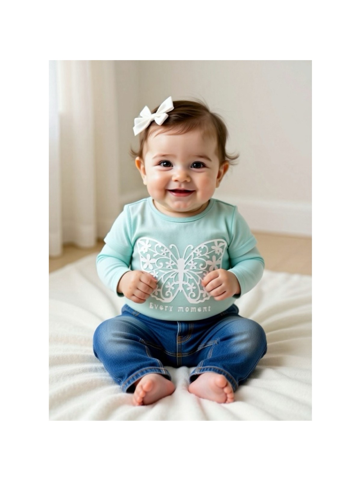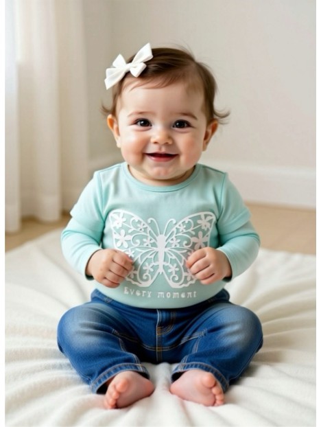 T-shirt manches longues coloris turquoise motif papillon