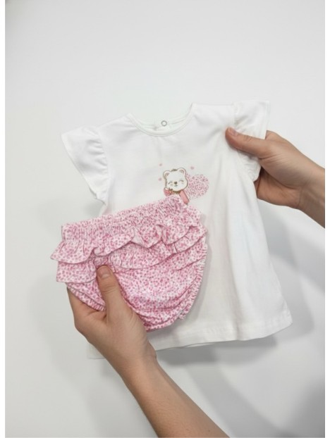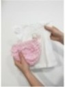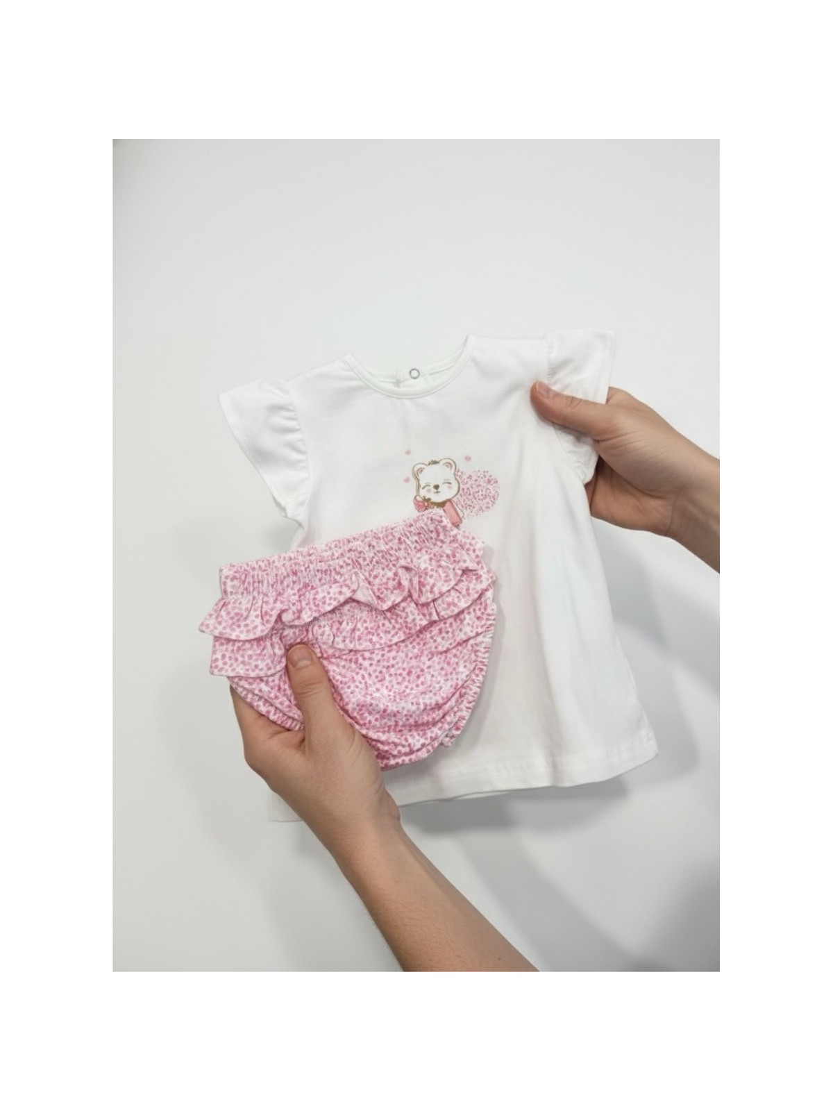 Détail : léger volants sur la culotte , culotte blanche avec des petits coeurs roses