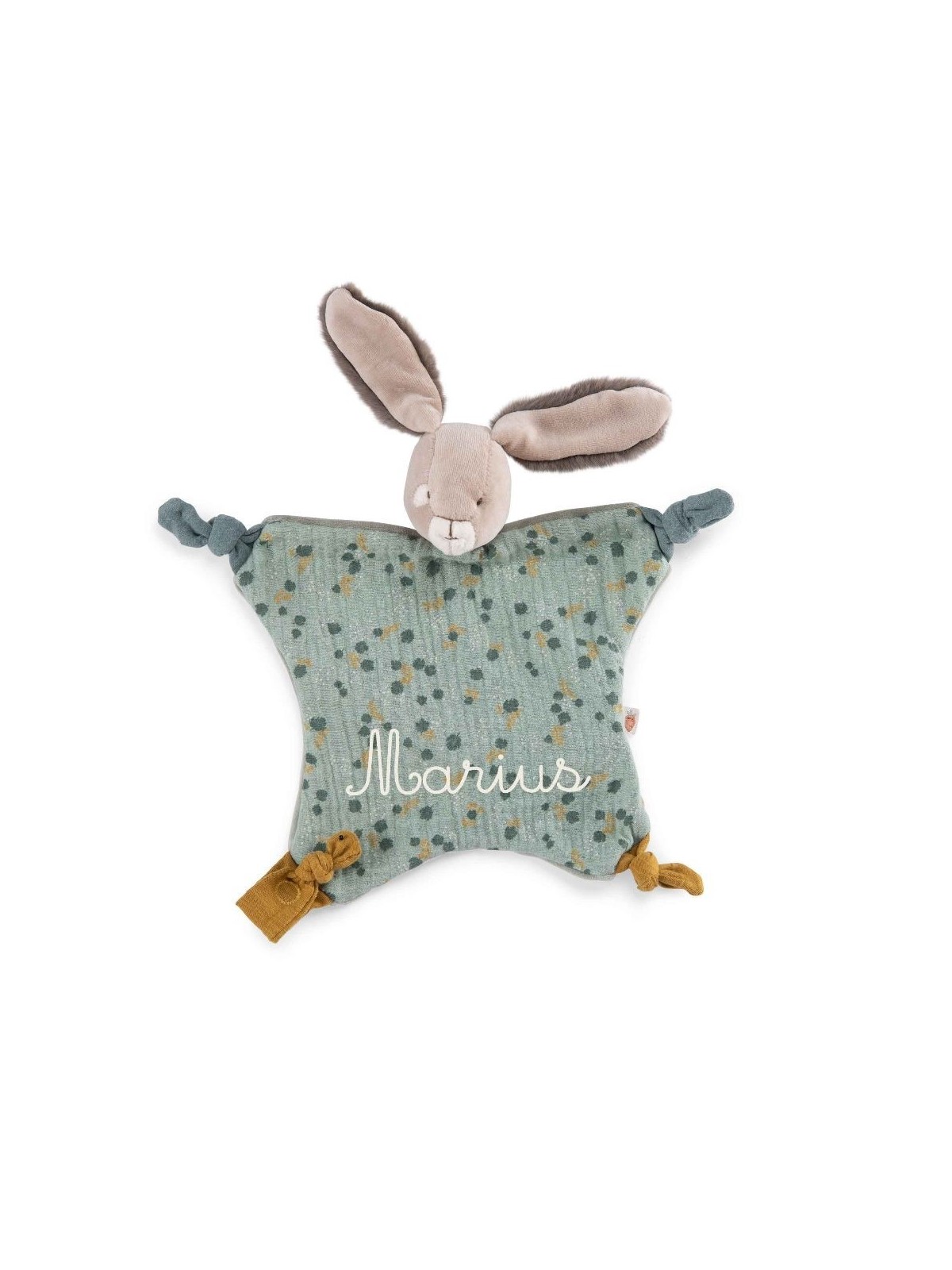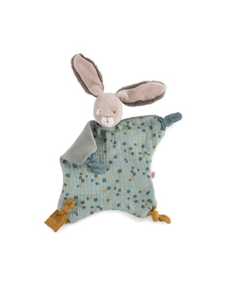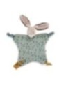 Doudou plat lapin sauge avec attache-tétine. Compagnon bi-matières réconfortant aux grandes oreilles toutes douces, orné de délicats motifs d'un côté. Noué à chaque coin, il est facile à saisir par les petites mains.