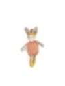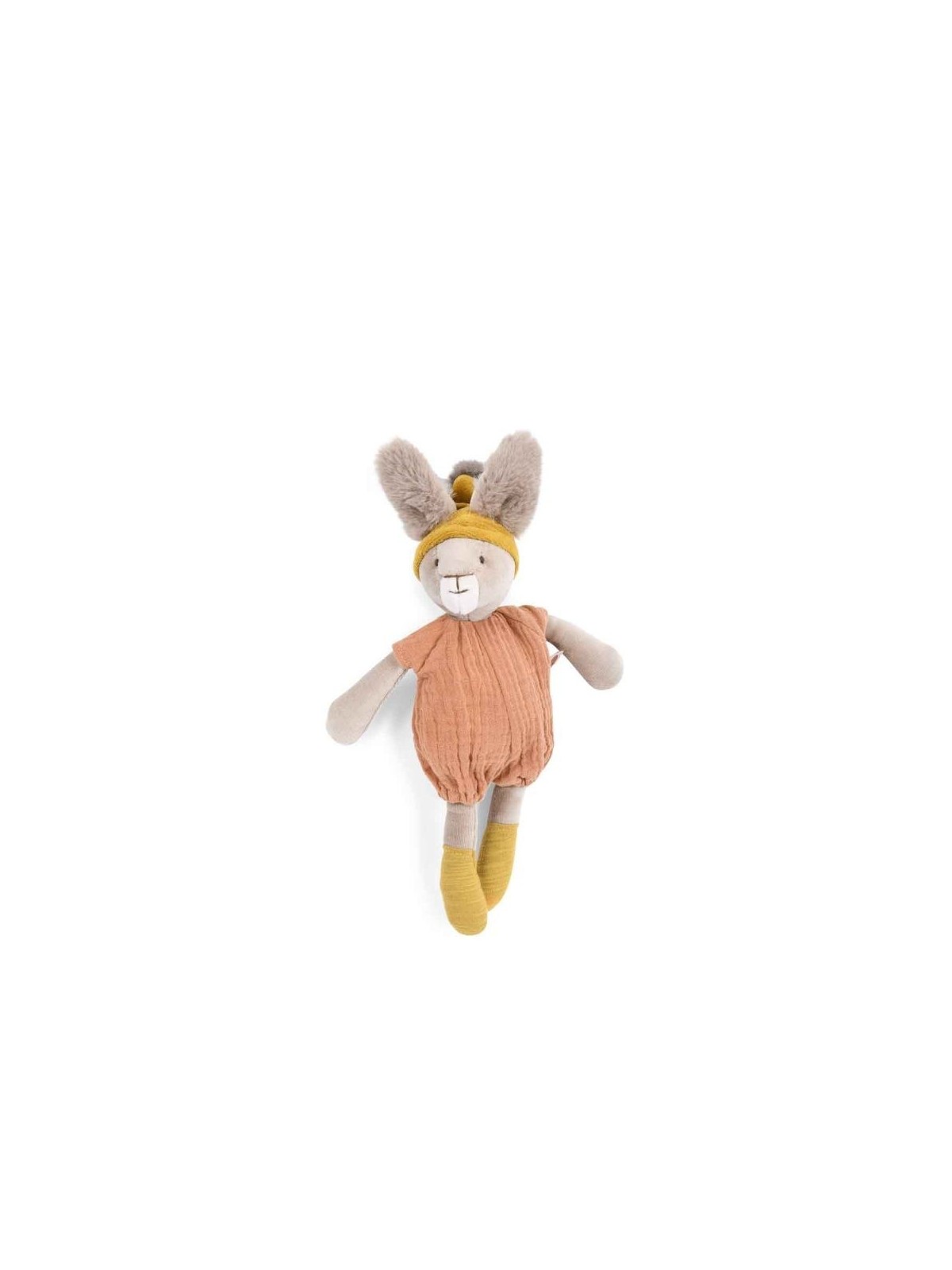 Petit lapin en velours éponge, vêtu de sa barboteuse sauge en lange. Coiffé d'un bonnet à pompons qui laisse passer ses grandes oreilles en fourrure toute douce, ce compagnon apaisant et rassurant est facile attraper par les petites mains.