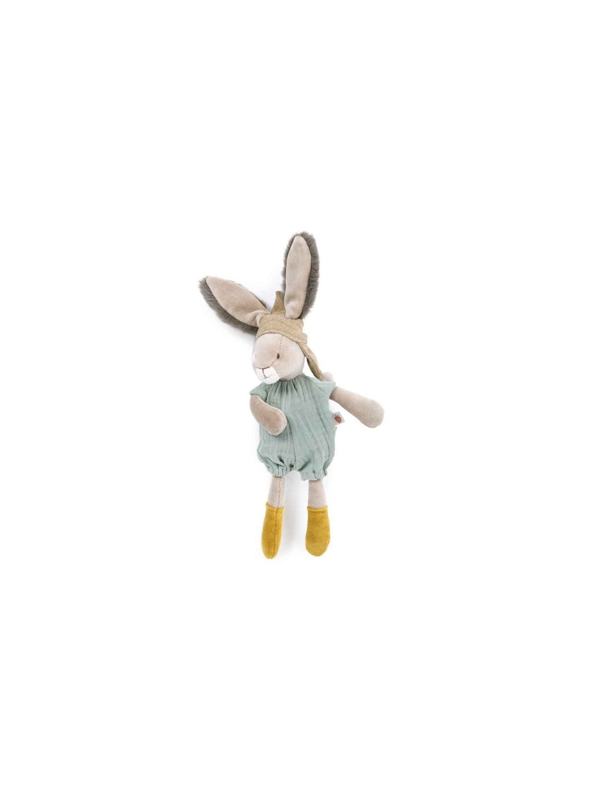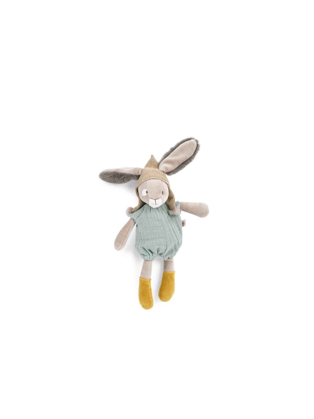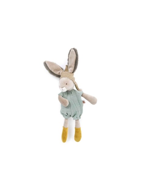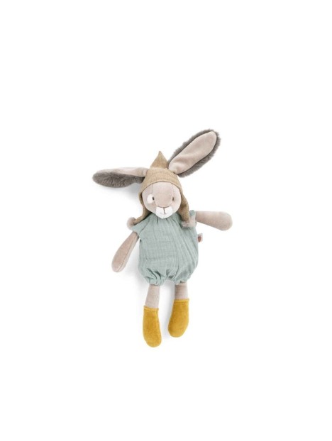 Petit lapin en velours éponge, vêtu de sa barboteuse sauge en lange. Coiffé d'un bonnet à pompons qui laisse passer ses grandes oreilles en fourrure toute douce, ce compagnon apaisant et rassurant est facile attraper par les petites mains.