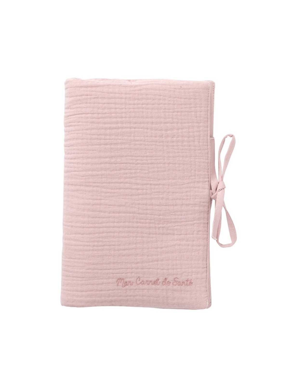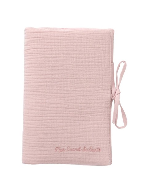 Un protège carnet de santé joli et pratique en double gaze pur coton, légèrement rembourré. Rabats à l'intérieur et liens à nouer sur le côté. Broderie "Mon carnet de santé" sur le devant.