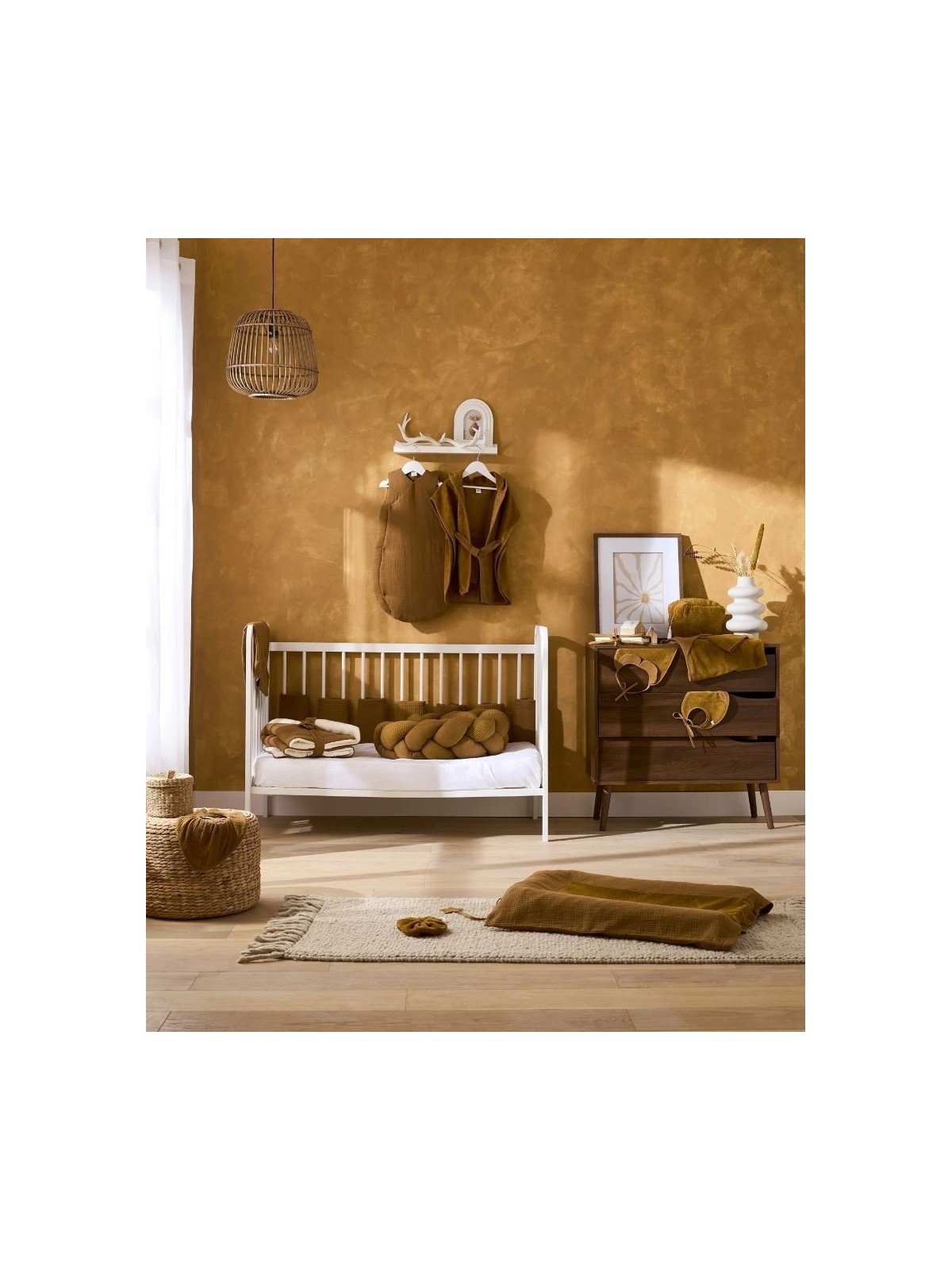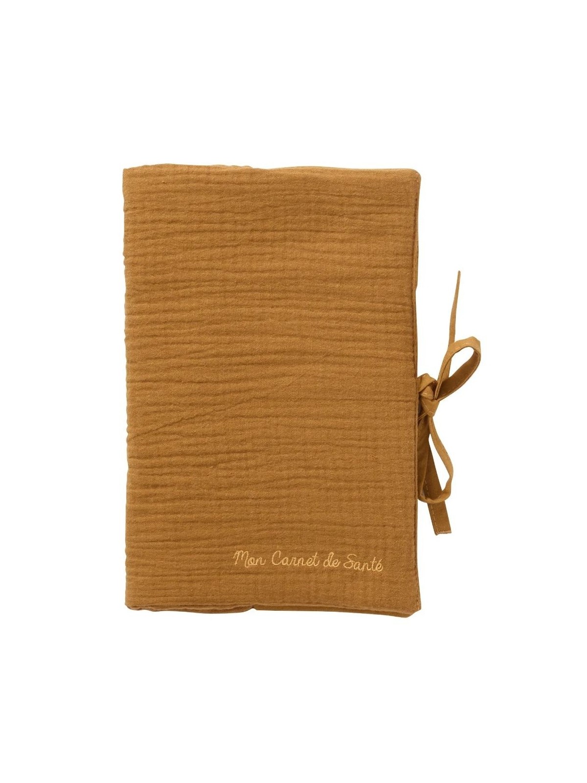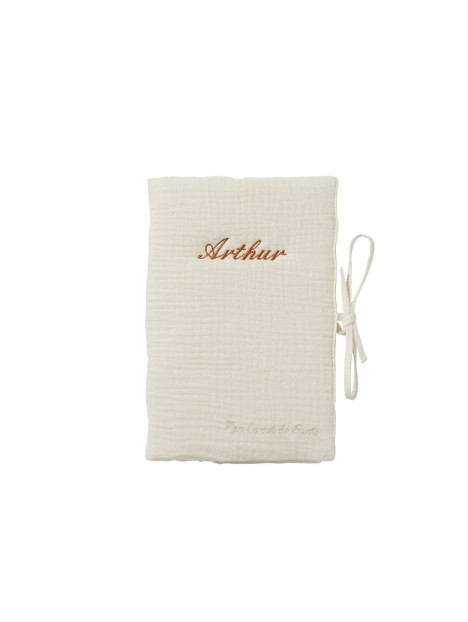 Un protège carnet de santé joli et pratique en double gaze pur coton, légèrement rembourré. Rabats à l'intérieur et liens à nouer sur le côté. Broderie "Mon carnet de santé" sur le devant.